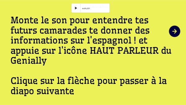 Monte le son pour entendre tes futurs camarades te donner des informations sur l'espagnol ! et appuie sur l'icône HAUT PARLEUR du Genially Clique sur la flèche pour passer à la diapo suivante