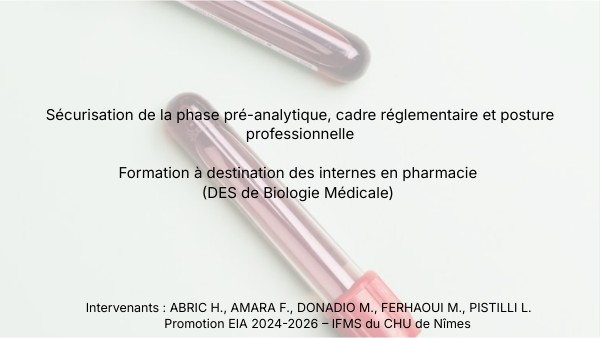 Sécurisation de la phase pré-analytique, cadre réglementaire et posture professionnelle Formation à destination des internes en pharmacie (DES de Biologie Médicale)