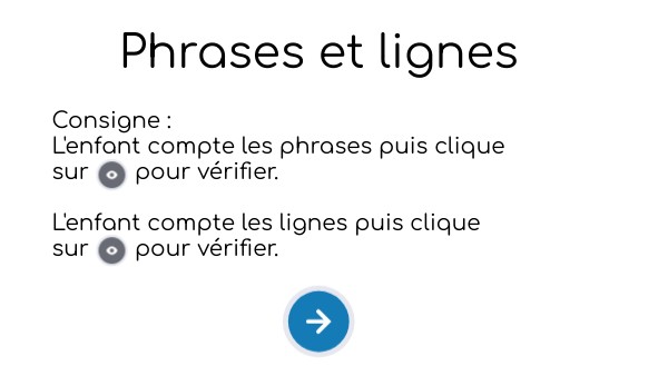 Consigne : L'enfant compte les phrases puis clique sur pour vérifier. L'enfant compte les lignes puis clique sur pour vérifier.