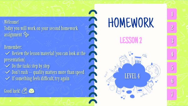 Welcome! Today you will work on your second homework assignment ✨ Remember: ✔ Review the lesson material (you can look at the presentation) ✔ Do the tasks step by step ✔ Don’t rush — quality matters more than speed ✔ If something feels difficult, try again Good luck! 💪😊