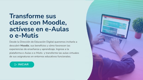 Desde la Dirección de Educación Digital queremos invitarle a descubrir Moodle, sus beneficios y cómo favorecen las experiencias de enseñanza y aprendizaje. Ingrese a la plataforma e-Aulas o e-Mutis y transforme las aulas virtuales de sus asignaturas en entornos educativos funcionales.