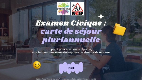 Félicitations, vous venez de terminer cette série d'entraînement . L'examen civique est une étape essentielle de votre parcours citoyen. Maîtriser ces notions, c'est non seulement préparer votre titre de séjour, mais c'est aussi comprendre les droits et les libertés qui nous unissent tous. Votre objectif : Pour être prêt le jour J, nous vous encourageons à viser un score d'au moins 80 % de bonnes réponses. Si vous n'avez pas encore atteint ce score, ne vous découragez pas ! Ce test est fait pour apprendre. Continuez ainsi, vous êtes sur la bonne voie pour réussir votre examen et nous vous souhaitons tout le succès possible dans vos démarches ! Pour s'entrainer : https://qcmcivique.fr/