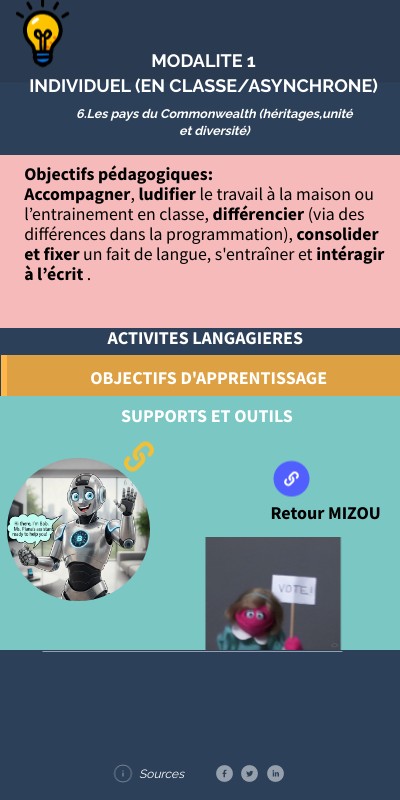 Objectifs pédagogiques:Différenciation pédagogique : L'élève choisit un support à sa portée . Interdépendance positive : La "Masterclass" ne peut pas être complète s'il manque les infos d'un des membres. Cela valorise chaque élève, même le plus en difficulté. Valorisation du "Peer-Teaching" : La transmission d'élève à élève est souvent plus "rentable" en termes de mémorisation. Expliquer une information à un camarade permet de l'ancrer plus efficacement que de simplement la lire. Sélection critique : Les élèves doivent trier les informations récoltées: "Qu'est-ce qui est essentiel pour que nos camarades comprennent le Commonwealth ?"