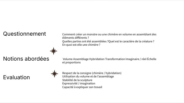 Volume Assemblage Hybridation Transformation Imaginaire / réel Échelle et proportions Respect de la consigne (chimère / hybridation)Utilisation du volume et de l’assemblageStabilité de la sculptureExpressivité / imaginationCapacité à expliquer son travail