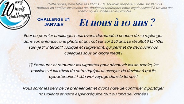 Cette année, pour fêter ses 10 ans, E.G. Tournier propose 10 défis sur 10 mois, mettant en lumière les talents de l’équipe et renforçant notre esprit collectif à travers des thématiques variées et inspirantes.