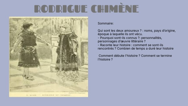 Sommaire: Qui sont les deux amoureux ? : noms, pays d’origine, époque à laquelle ils ont vécu.- Pourquoi sont-ils connus ?: personnalités, personnages d’œuvre littéraire ?- Raconte leur histoire : comment se sont-ils rencontrés ? Combien de temps a duré leur histoire Comment débute l'histoire ? Comment se termine l’histoire ?