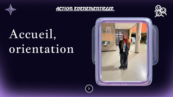 Le proviseur du lycée André Lurçat organise chaque année scolaire, deux réunions parents professeurs. Une au mois de janvier et une autre au mois de mars. On nous sollicite régulièrement pour accueillir filtrer et orienter les parents et des élèves. Je suis donc placée à l'entrée principal du lycée et dans les couloirs du lycée.