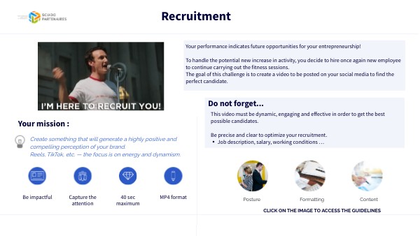Votre performance indique de futures opportunités pour votre entreprise ! Pour faire face à l’augmentation potentielle de l’activité, vous décidez d’embaucher à nouveau de nouveaux employés afin de continuer à assurer les séances de fitness. L’objectif de ce défi est de créer une vidéo à publier sur vos réseaux sociaux pour trouver le candidat idéal.