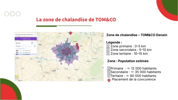 Zone de chalandise – TOM&CO Denain Légende : 🟥 Zone primaire : 0–5 km🟦 Zone secondaire : 5–10 km🟪 Zone tertiaire : 10–15 km Zone : Population estimée 🟥Primaire : ≈ 12 000 habitants 🟦Secondaire : ≈ 35 000 habitants 🟪Tertiaire : ≈ 80 000 habitants Placement de la concurence