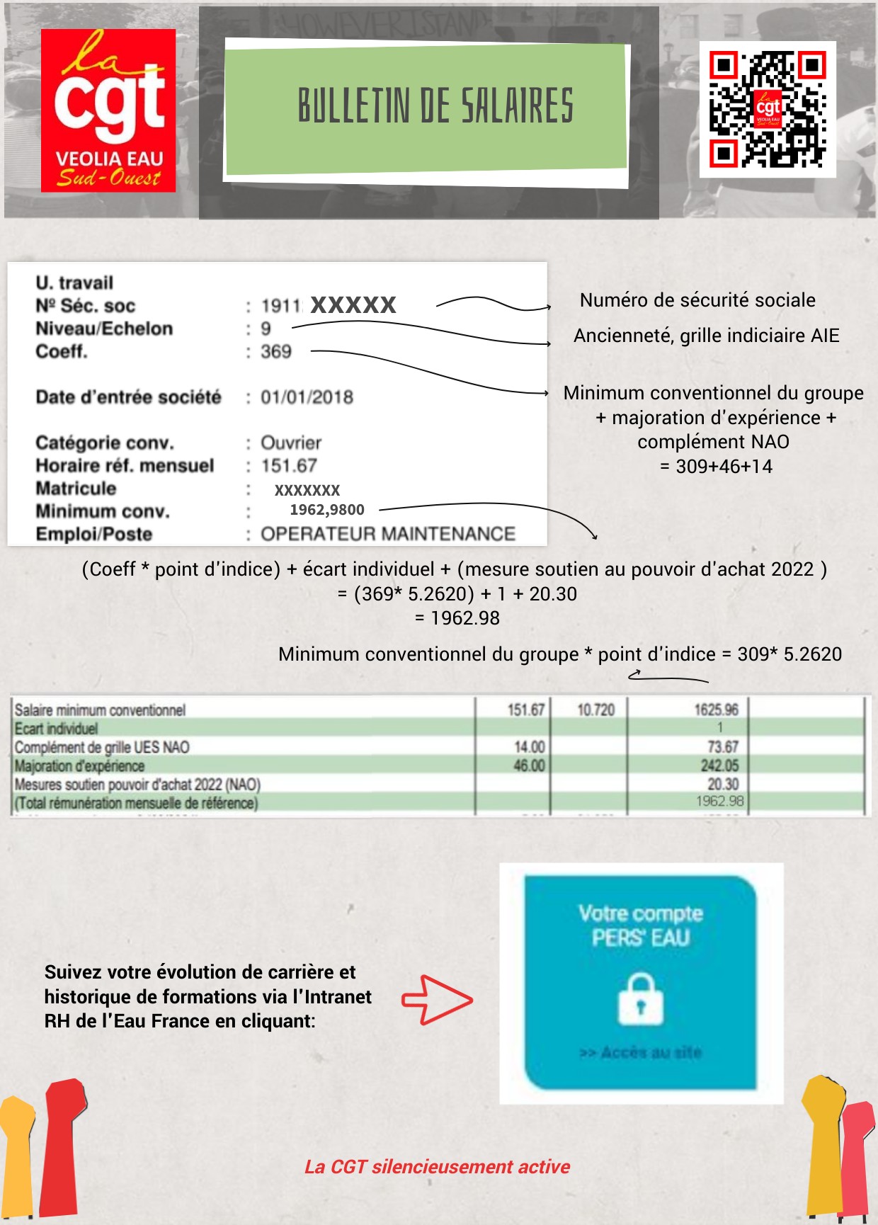 (Coeff * point d'indice) + écart individuel + (mesure soutien au pouvoir d'achat 2022 ) = (369* 5.2620) + 1 + 20.30 = 1962.98