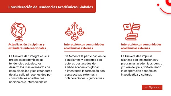 La Universidad integra en sus procesos académicos las tendencias actuales, los desarrollos más avanzados de cada disciplina y los estándares de alta calidad reconocidos por comunidades académicas nacionales e internacionales.