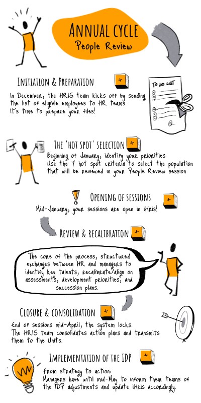 The core of the process, structured exchanges between HR and managers to identify key talents, recalibrate/align on assessments, development priorities, and succession plans.