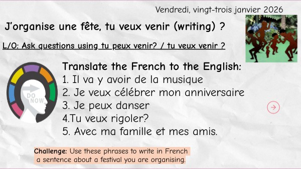 Write 5 short sentences in French about a party you are planning. Try to use Il va y avoir (there is going to be). You can also use je peux or tu veux venir ? Mention one activity (dance, music, sing, laugh). success criteria (huge impact for Y8)