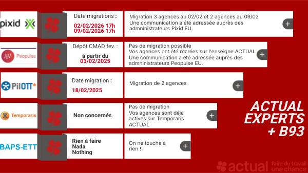 Pas de migration possibleVos agences ont été recrées sur l'enseigne ACTUAL Une communication a été adressée auprès des admninistrateurs Peopulse EU.