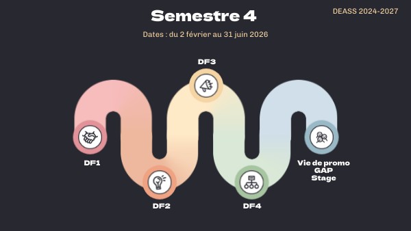 Objectifs du module : s'inscrire dans un travail d'équipe; coordonner les acteurs contribuant au plan d'actions; assurer un rôle de médiation; promouvoir l'accès aux droits, services et dispositifs. Cours : - TD DF4 - Liens note partenariale et Q2 - Entrainement devoir sur table type DE - Une politique sociale - Oraux blancs (assiste aux oraux du groupe la 1/2 journée) - Debrief oral blanc - Entrainement devoir sur table type DE