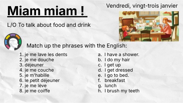 Write about what you eat. E.g. Le matin, pour le petit déjeuner, je mange des céréáles et je bois du thé. Puis au collège, je mange du poisson et des frites. Challenge: Say what a family member eats. E.g. Ma mère mange..... elle boit.... Challenge: use time expressions: le matin = in the morning à midi = at midday après le collège = after school le soir = in the evening