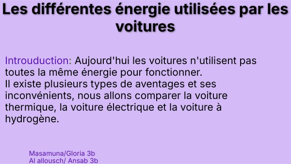 Introuduction: Aujourd'hui les voitures n'utilisent pas toutes la même énergie pour fonctionner. Il existe plusieurs types de aventages et ses inconvénients, nous allons comparer la voiture thermique, la voiture électrique et la voiture à hydrogène.
