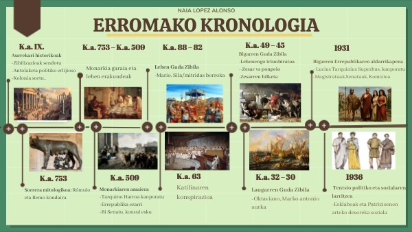 Lehenengo Triunbiratoa (K.a. 60):Zesar, Ponpeio eta Krasoren arteko itun politiko informala, boterea elkarrekin kontrolatzeko. Bigarren Guda Zibila (K.a. 49–45): Kraso hil ondoren Triunbiratoa hautsi zen. Zesarrek Rubikon zeharkatu eta Ponpeioren aurka borrokatu zuen; Zesar garaile atera zen eta Ponpeio ihesean hil zuten. Zesarren hilketa (K.a. 44): Diktadore bihurtzean, senatariek Errepublika arriskuan ikusi eta Zesar Senatuan hil zuten konspirazio baten bidez.