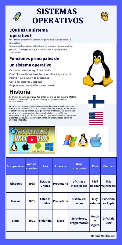 Un sistema operativo es el software principal de un ordenador o dispositivo.Se encarga de gestionar el hardware (procesador, memoria, disco, pantalla…) y de permitir que el usuario ejecute programas y aplicaciones.