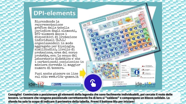 Consiglio! Cominciate a posizionare gli elementi della legenda che sono facilmente individuabili, poi cercate il resto delle tessere. Le tessere che vengono posizionate correttamente fra di loro si "saldano" e compongono un blocco solidale. Lo sfondo ha solo lo scopo di indicare il perimetro della tabella. Premi il bottone Blu per iniziare!