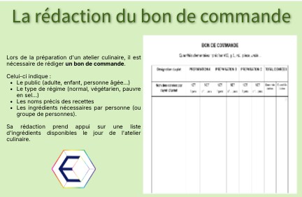 Sa rédaction prend appui sur une liste d'ingrédients disponibles le jour de l'atelier culinaire.La rédaction du bon de commande