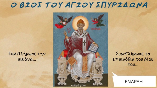 1. Κάντε κλικ στις εικόνες, για να δείτε τις διηγήσεις περιστατικών από τον βίο του Αγίου Σπυρίδωνα. 2. Σύρτε τις εικόνες στο κατάλληλο πλαίσιο, ώστε να συμπληρωθεί η εικόνα του Αγίου Σπυρίδωνα, αντιστοιχίζοντας το εικονίδιο που συνοδεύεται από τη διήγηση του βίου του με τον τίτλο μέσα στο πλαίσιο που βρίσκεται γύρω από την κεντρική εικόνα του.