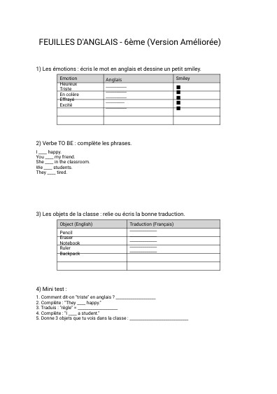 FEUILLES D'ANGLAIS - 6ème (Version Améliorée)