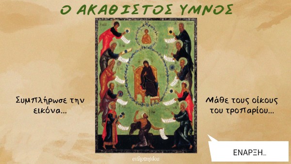 1. Κάντε κλικ στις εικόνες, για να δείτε το κείμενο του αντίστοιχου οίκου. 2. Σύρτε τις εικόνες στο κατάλληλο πλαίσιο, ώστε να συμπληρωθεί η εικόνα του Ακάθιστου, αντιστοιχίζοντας το εικονίδιο που συνοδεύεται από το κείμενο του οίκου με το αντίστοιχο Γράμμα του Αλφάβητου. 3. Κάνε κλικ στην κεντρική εικόνα στους προφήτες, για να μάθεις την προφητεία τους.