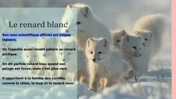 Son nom scientifique officiel est Vulpes lagopus. On l’appelle aussi renard polaire ou renard arctique. On dit parfois renard bleu quand son pelage est foncé, mais c’est plus rare. Il appartient à la famille des canidés, comme le chien, le loup et le renard roux.