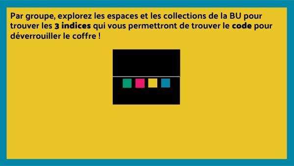 Par groupe, explorez les espaces et les collections de la BU pour trouver les 3 indices qui vous permettront de trouver le code pour déverrouiller le coffre !