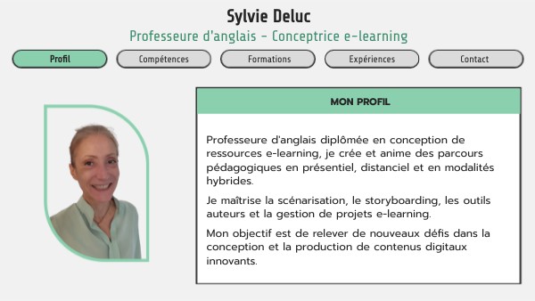 Professeure d'anglais diplômée en conception de ressources e-learning, je crée et anime des parcours pédagogiques en présentiel, distanciel et en modalités hybrides. Je maîtrise la scénarisation, le storyboarding, les outils auteurs et la gestion de projets e-learning. Mon objectif est de relever de nouveaux défis dans la conception et la production de contenus digitaux innovants.