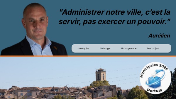 "Je m’engage avec Aurélien pour dynamiser Pertuis, être à l’écoute de chaque pertuisien et donner envie du bien vivre à Pertuis."