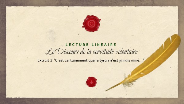3e extrait du Discours de la servitude volontaire - p. 71-72 Edition Belin Déclic Etienne de La Boétie compose ce discours probablement en 1548, alors qu'il a entre 16 et 20 ans ; le texte, fortement polémique, restera sous la forme d'un manuscrit non édité jusqu'après la mort de son auteur. Humaniste et féru de culture antique, engagé dans la réflexion politique de son temps, La Boétie y livre une remise en question de la vision habituelle du rapport du peuple à la tyrannie et implique le lecteur dans son argumentation. Dans ce passage, La Boétie arrive à la fin de son argumentation et après avoir défini le concept de servitude volontaire, interpellé les peuples sur leur responsabilité et expliqué les manoeuvres du tyran pour nuire à la liberté, il a expliqué avec l'exemple de Néron, l'impossibilité pour le tyran de tisser des liens d'attachement véritable. Il en vient à définir ce qu'est l'amitié véritable et pourquoi elle échappe au tyran. Ainsi on se demandera comment La Boétie fait-il prendre conscience au lecteur du pouvoir de l'amitié face à la tyrannie. On observe 3 mouvements : 1. L'incompatibilité entre amitié et tyrannie [du début à "... complices.] 2. Les relations sous la tyrannie [de "Or quand bien même... à "...maître de tous."] 3. L'amitién valeur essentielle pour lutter contre le tyran ["N'est donc pas..." à la fin]