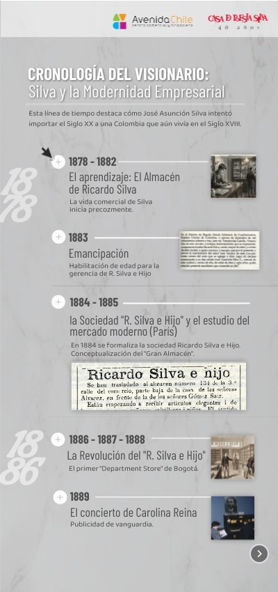 Si bien Silva es reconocido como pionero del Modernismo literario, en 1890 encarna también la llegada de la Modernidad material a Bogotá. En un ingente esfuerzo por refinar el gusto de los ciudadanos, concibe la idea de unir sus almacenes: el Almacén Nuevo y el Almacén de Cuelgas y monta la que será la primera tienda por departamentos de la ciudad, R. Silva e Hijo, inspirada en el estilo europeo. Un alucinante establecimiento comercial dividido por secciones y surtido con mercancías de lujo nunca antes vistas que trae a la fría ciudad andina las últimas tendencias de la moda internacional: un espejismo de París en plena Calle Real.