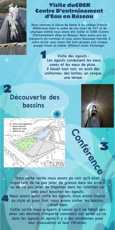 Nous sommes la classe de 6ème A du collège François Mitterrand. Dans le cadre de nos cours de SVT et de physique-chimie nous avons été visiter le CDER (Centre D’Entrainement d’Eau en Réseau). Nous avons pris les transports en commun et nous avons beaucoup marché. A notre arrivé nous avons fait trois groupes puis chaque groupe faisait un atelier différent avant d’échanger.