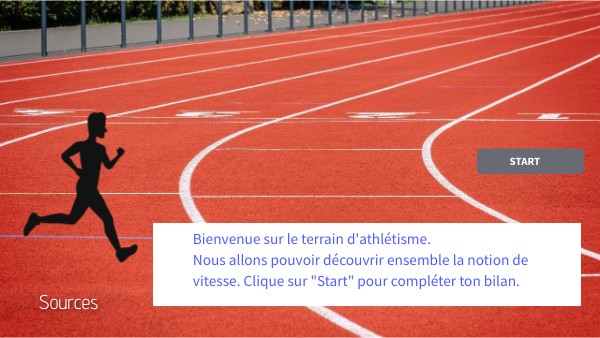 Bienvenue sur le terrain d'athlétisme.Nous allons pouvoir découvrir ensemble la notion de vitesse. Clique sur "Start" pour compléter ton bilan.
