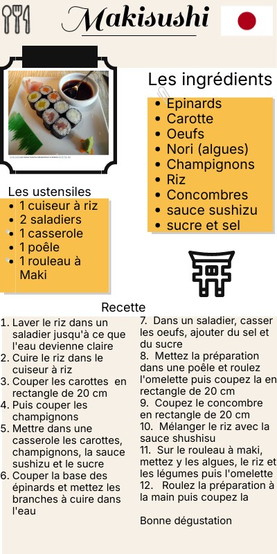 7. Dans un saladier, casser les oeufs, ajouter du sel et du sucre 8. Mettez la préparation dans une poêle et roulez l'omelette puis coupez la en rectangle de 20 cm 9. Coupez le concombre en rectangle de 20 cm 10. Mélanger le riz avec la sauce shushisu 11. Sur le rouleau à maki, mettez y les algues, le riz et les légumes puis l'omelette 12. Roulez la préparation à la main puis coupez la Bonne dégustation