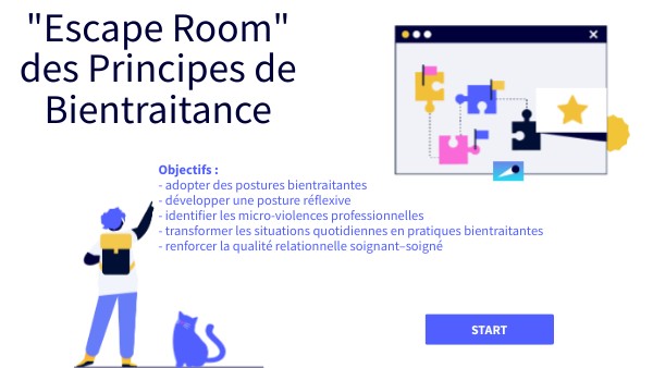 Vous êtes une équipe d’aides-soignants nouvellement affectée dans l’unité « Harmonie ». Un signalement anonyme a été fait : « Des situations de maltraitance ordinaire se produisent dans le service. »Le système éthique de l’établissement a verrouillé l’unité. Pour avancer, vous devez "valider" la bientraitance professionnelle en répondant aux Quiz.