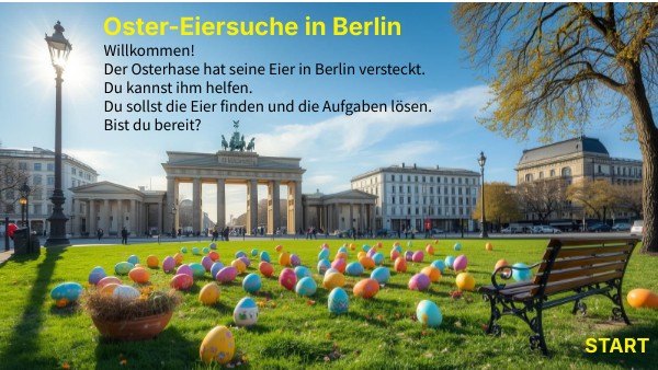 Willkommen!Der Osterhase hat seine Eier in Berlin versteckt. Du kannst ihm helfen. Du sollst die Eier finden und die Aufgaben lösen. Bist du bereit?