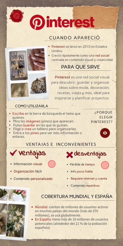 Pinterest es una red social visual para descubrir, guardar y organizar ideas sobre moda, decoración, recetas, viajes y más, ideal para inspirarse y planificar proyectos.