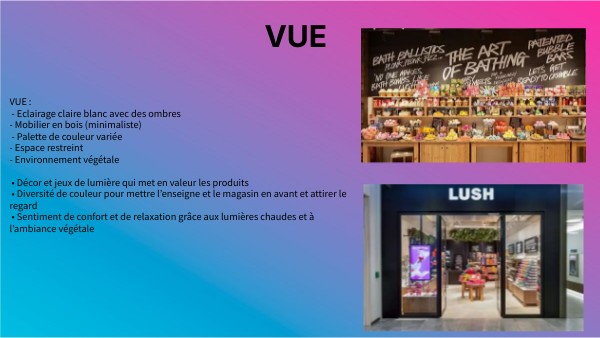 VUE : - Eclairage claire blanc avec des ombres - Mobilier en bois (minimaliste) - Palette de couleur variée - Espace restreint - Environnement végétale • Décor et jeux de lumière qui met en valeur les produits • Diversité de couleur pour mettre l’enseigne et le magasin en avant et attirer le regard • Sentiment de confort et de relaxation grâce aux lumières chaudes et à l’ambiance végétale