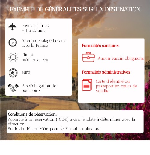 Conditions de réservation: Acompte à la réservation (100€) avant le ...date à déterminer avec la direction Solde du départ 250€ pour le 31 mai au plus tard