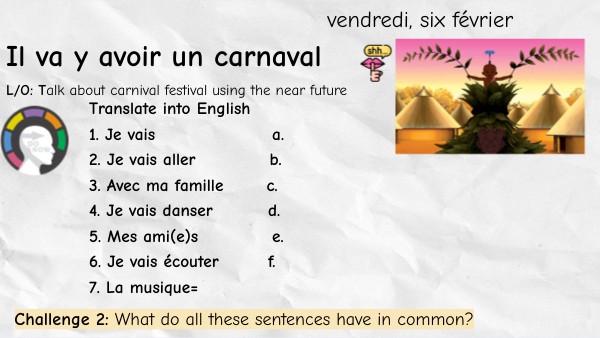 Imagine you are going to the carnival with Kirikou Design your own carnival costume and mask on paper. Then, write 5 sentences in French: 1 × il va y avoir 3 × je vais + infinitive 1 opinion + reason (parce que…) to describe your carnival day