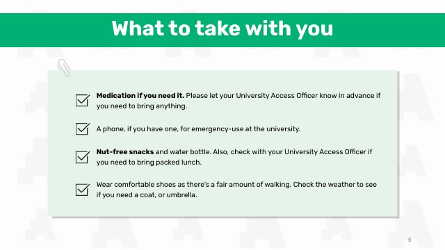 Nut-free snacks and water bottle. Also, check with your University Access Officer if you need to bring packed lunch.