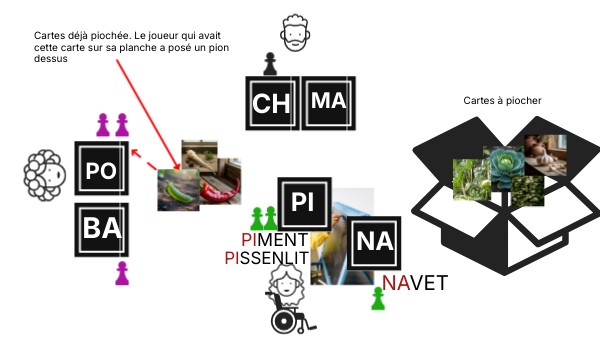 Cartes déjà piochée. Le joueur qui avait cette carte sur sa planche a posé un pion dessus