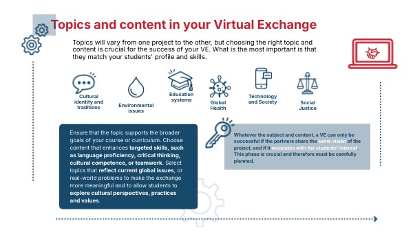 Ensure that the topic supports the broader goals of your course or curriculum. Choose content that enhances targeted skills, such as language proficiency, critical thinking, cultural competence, or teamwork. Select topics that reflect current global issues, or real-world problems to make the exchange more meaningful and to allow students to explore cultural perspectives, practices and values.