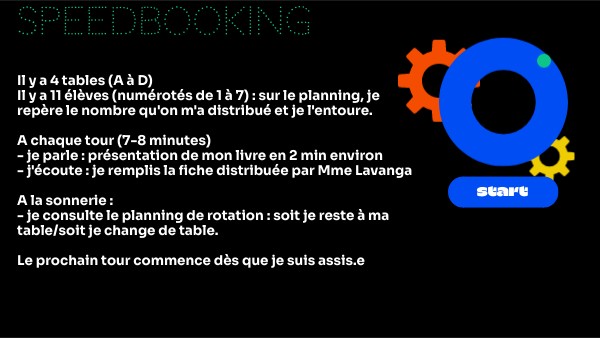 Il y a 4 tables (A à D) Il y a 11 élèves (numérotés de 1 à 7) : sur le planning, je repère le nombre qu'on m'a distribué et je l'entoure. A chaque tour (7-8 minutes) - je parle : présentation de mon livre en 2 min environ - j'écoute : je remplis la fiche distribuée par Mme Lavanga A la sonnerie : - je consulte le planning de rotation : soit je reste à ma table/soit je change de table. Le prochain tour commence dès que je suis assis.e