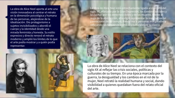 La obra de Alice Neel está estrechamente ligada al contexto del siglo XX, marcado por la Gran Depresión, los cambios sociales y las luchas por los derechos civiles y de las mujeres. Frente al auge de la abstracción, ella eligió representar la realidad social y emocional de su tiempo, dando voz a personas marginadas y reflejando las tensiones políticas y culturales de su época.