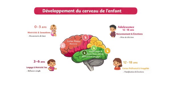 Hippocampe Zone : Partie du lobe temporal médial Fonction : mémoire, apprentissage et navigation spatiale Développement : Naissance–3 ans : formation de souvenirs procéduraux et sensorimoteurs. 3–12 ans : mémoire épisodique et acquisition scolaire. Adolescence : consolidation des souvenirs et apprentissage complexe. Amygdale Zone : Lobe temporal médial Fonction : régulation des émotions, perception de la peur et motivation sociale Développement : Petite enfance : réponses émotionnelles primaires. 6–12 ans : apprentissage émotionnel, empathie et socialisation. Adolescence : sensibilité accrue aux émotions et aux interactions sociales. Aires associatives Zones : Cortex pariétal et temporal associatif Fonction : intégration des informations sensorielles, langage, calcul, raisonnement Développement : 3–12 ans : apprentissage du langage complexe, mathématiques et lecture. Adolescence : pensée critique, métacognition et résolution de problèmes complexe