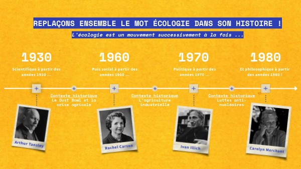 Au début des années 1960, l’écologie devient une question de société, notamment avec la publication de "Printemps silencieux" de l’écologue états-unienne Rachel Carson (1962). L'autrice alerte le grand public sur les dangers des pesticides et herbicides qui sont employés massivement dans la Révolution verte à partir des années 1950. Carson les appelle “biocides”, car une fois aspergés sur les champs, ils se répandent partout dans les écosystèmes, mettent en danger tous les vivants, ainsi que la capacité de la vie à se renouveler (il s’agit de perturbateurs endocriniens, carcinogènes…). "Printemps silencieux" devient un best-seller mondial et donne lieu à un mouvement social : le public demande des réponses aux décideurs. Le président étatsunien crée une comité d’enquête qui mènera plus tard à la création de l’Agence pour la protection de l’environnement et l’interdiction du DDT, un des biocides les plus dangereux et répandus. C’est le moment où le grand public prend conscience des enjeux environnementaux, qui quittent la sphère purement scientifique pour devenir une question de société.